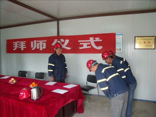 2012年4月11日上午,二分公司在太原滨河西路南延冶峪雨水泵站项目部举行了张晓东、李峻、王鹏三位同志拜李国宝为师傅,学习做人做事及现场管理各方面知识的拜师仪式,三位徒弟现场行拜师礼,向师傅递交了拜师协议。此项活动是为了达到集团公司提出的全面发展,提高现场管理水平的要求,紧密结合分公司实际,培养青年人学技术、做好人、尊师学艺的风气,营造和谐发展,尽快成才,为企业尽快培养青年人学好技术而举行的。仪式由副经理刘海飞主持,分公司经理孙庆福讲话,项目部全体管理人员参加。