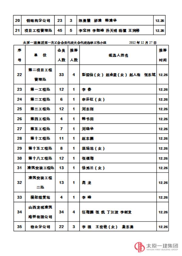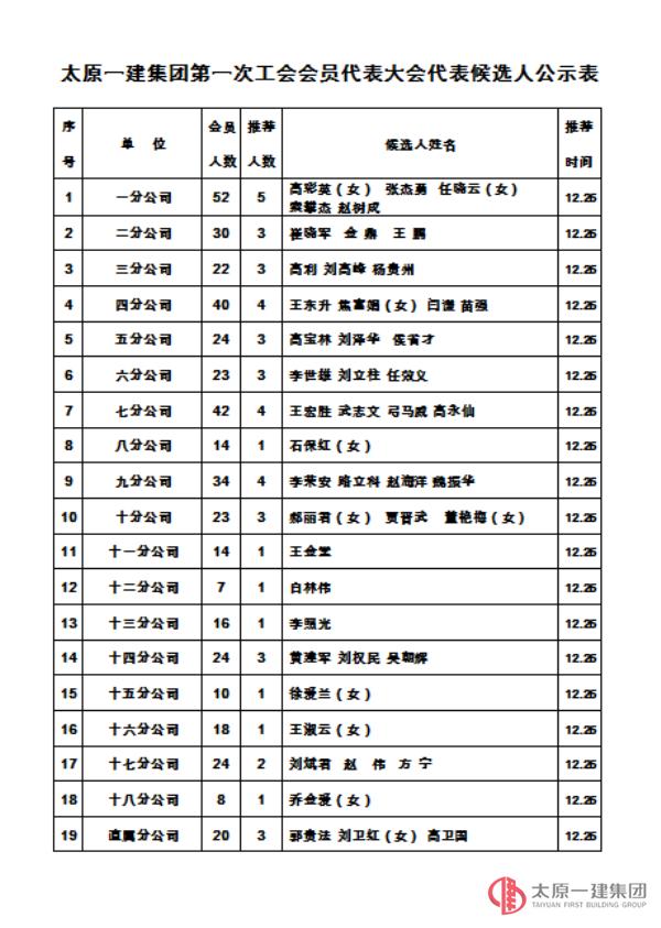 12月20日,集团公司召开了一届二次职代会和第一次工会会员代表大会筹备工作会议。会上对一届二次职代会和第一次工会会员代表大会的筹备工作进行了安排部署。会上,通过了第一次工会会员代表大会代表选举办法,对第一阶段的选举工作进行了布置,截止12月26日,各单位代表推荐工作按期完成,应推荐代表候选人96名,实际推荐代表候选人96名。经代表选举工作小组根据有关规定对候选人资格审查,推荐的代表候选人资格全部有效,现对第一批85名候选人名单进行公示,公示期3天,28日至30日。如对代表候选人资格有异议,可以通过以下联系方式向选举工作小组反映,我们将按照有关规定办理。
