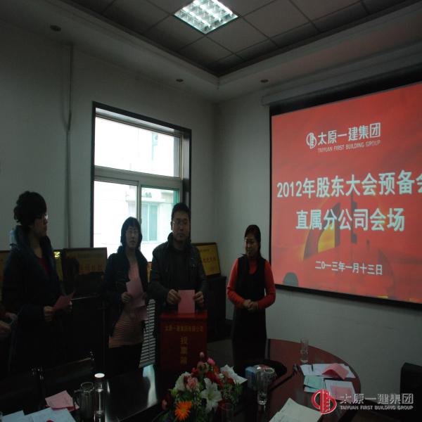 1月13日上午,直属分公司组织全体股东在分公司会议室召开太原一建集团2012年度股东大会预备会。本次会议应到股东9人,出资额人民币437394元;实到股东8人,出资额人民币410346元。会议由分公司经理郭贵法主持。会议的内容:1、分公司经理郭贵法传达了 “1月12日”集团公司会议精神并详细讲解7个报告和通报了通过的《组织机构人员产生办法》、《授权委托实施细则》。2、出席会议的股东经过讨论一致举手表决,通过了各项报告决议的草案。3、对集团公司的董事会、监事会成员进行了投票选举。4、分公司经理郭贵法要求全体股东围绕本次会议的主题,对分公司下一步怎么办提出建设性意见。最后,郭经理号召全体股东作为企业的一份子发挥好主人的作用,同时全体股东对集团公司领导实行民主治企的良策充满信赖和希望!