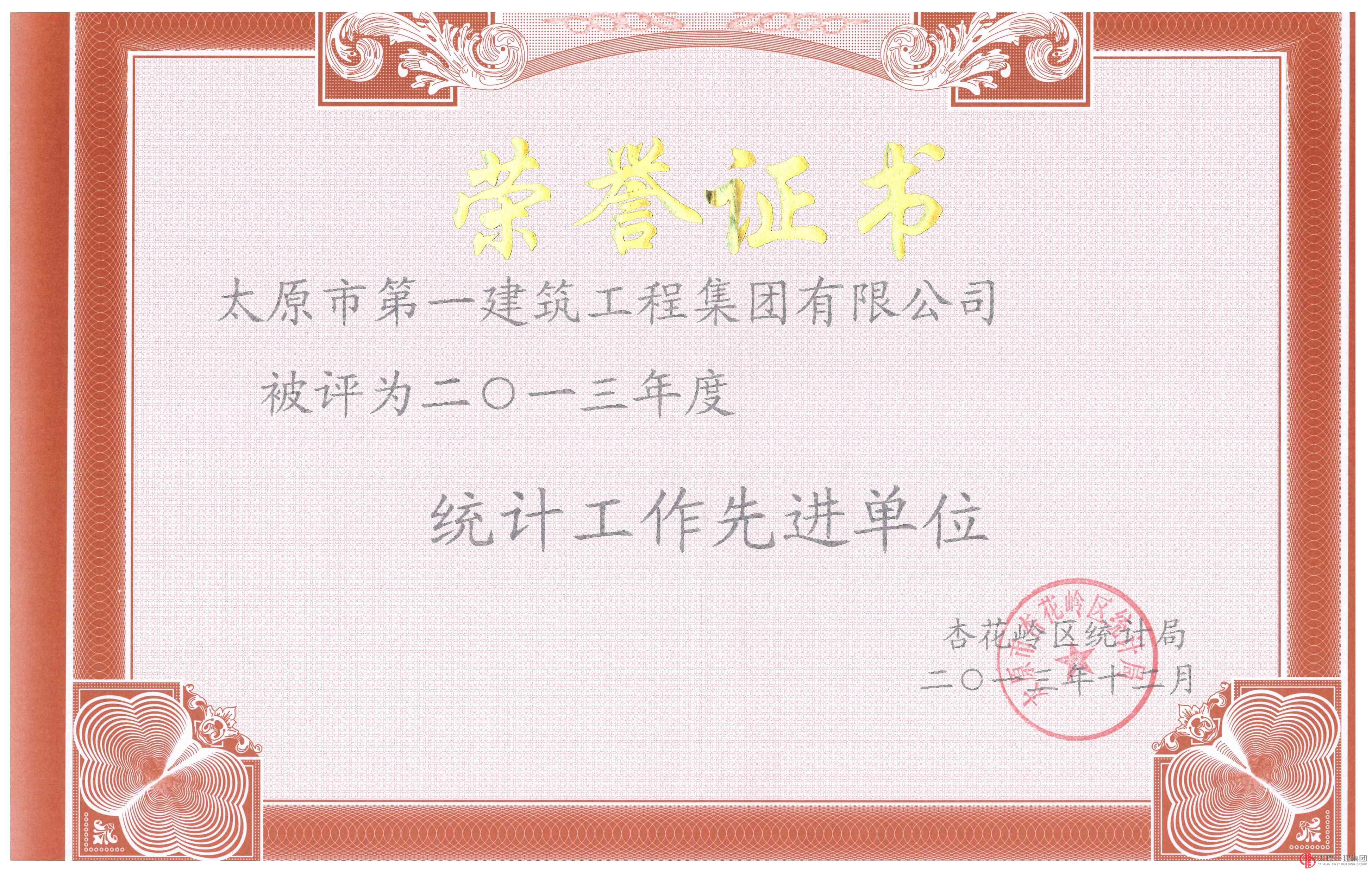 集团公司工程管理部在公司领导的大力支持和基层单位统计员的配合下,对全年施工产值等指标进行了精确统计和及时上报,较好的完成了全年统计工作和统计调查工作,取得一定成绩,分别被杏花岭区统计局评为“统计工作先进单位”及国家统计局太原调查队评为“太原市企业采购经理调查工作优秀单位”,同时总经济师王建萍、工程管理部冯志芳被评为“二〇一三年度统计工作先进个人”, 这些荣誉的取得,充分肯定了我集团公司在统计工作方面做出的不屑努力,也是对基层单位统计人员工作的认可,在今后的统计工作中,我们要再接再厉取得更多的成绩。