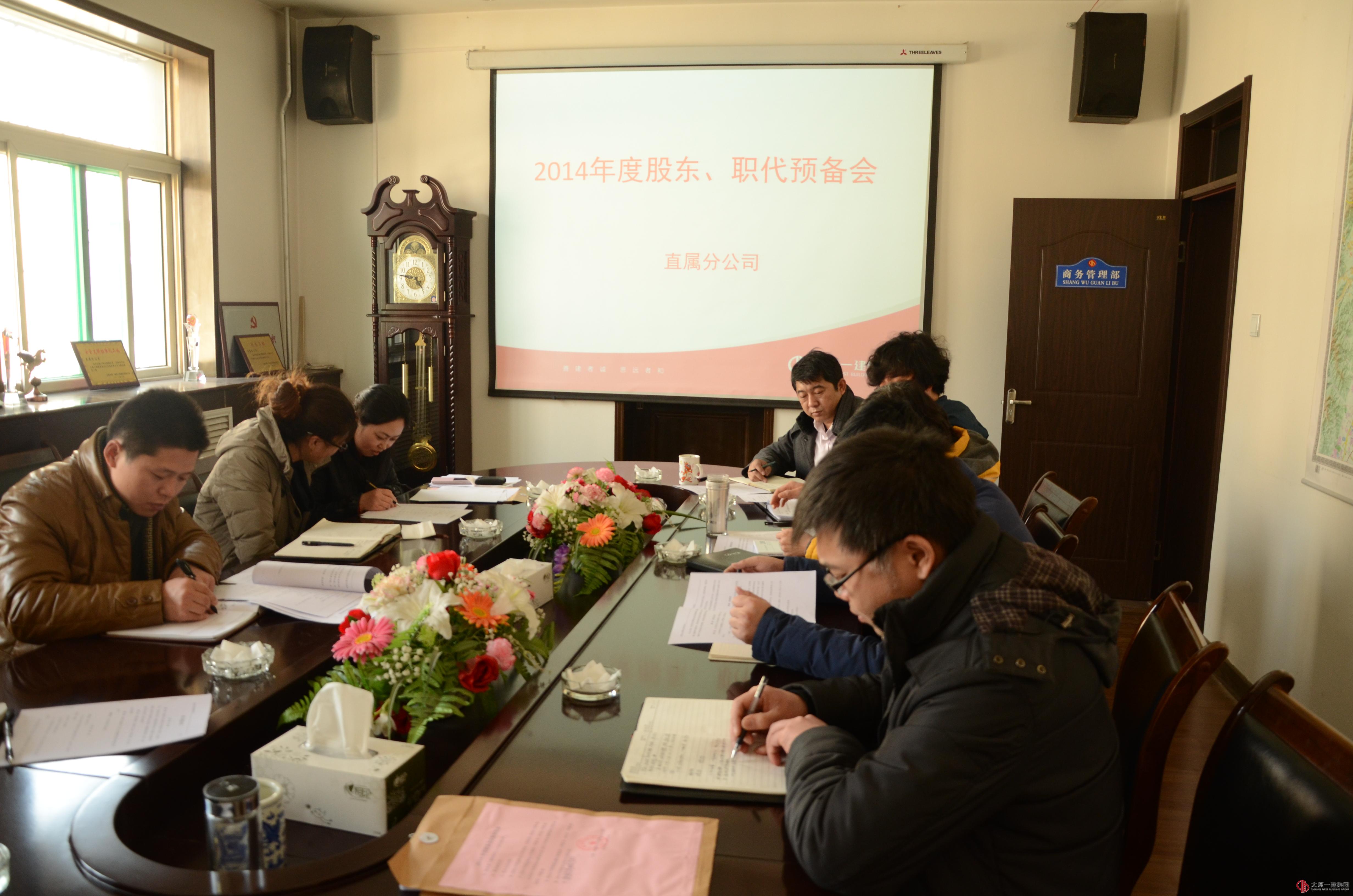 1月22日下午,直属分公司在分公司会议室召开了2014年股东会议,会议应到股东11人,实到10人,1人委托(请假)。会议由分公司经理郭贵法主持。会议的主要内容有: 1、分公司经理郭贵法传达了1月20日会议精神。2、全体股东认真研习了股东会的《董事会2014年工作报告》、《监事会2014年工作报告》、《2014年财务决算报告》、《2014年度利润分配方案报告》及《2015年财务预算方案报告》和职工代表会的相关规章制度(规章制度1-6册,共计13项内容)。3、与人员相互探讨并对以上内容逐项表决,同时全票通过决议。让大家真正做到了“企业是我们的家,建设靠我们大家”的氛围。4、分公司经理郭贵法讲到关于集团公司开展“三项建设工作”的重要性,要求大家深刻领会,把三项建设落到实处,并且要常抓不懈。本次会议给予了每位股东充分的权利,促动每位股东切实履行好主人翁的职责,起到楷模作用,为企业的繁荣发展做出贡献!