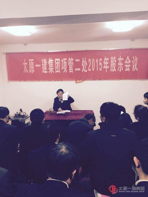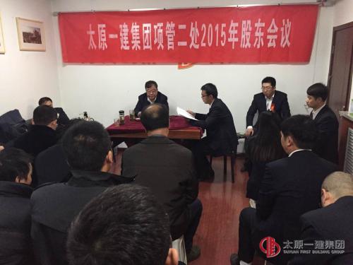 2016年1月16日下午,项管二处召开了2015年度股东会议。会议由授权委托人王斌主持。本次会议严格按照规定程序进行,会上全体股东听取了2015年度董事会工作报告(草案);监事会工作报告(草案);2015年度财务决算报告(草案)、2015年度利润分配方案(草案)和2016年度财务预算方案(草案)、《第二个三年发展规划》执行情况和《第三个三年发展规划》制定说明(草案)等七项报告,按照规定程序,经全体股东讨论、表决,一致同意并通过上述报告。处长王斌宣读了第三届董事会董事、监事会监事(股东)候选人的简历,进行投票选举,公示了选举结果。会后办公室将会议资料汇总,上报集团公司。