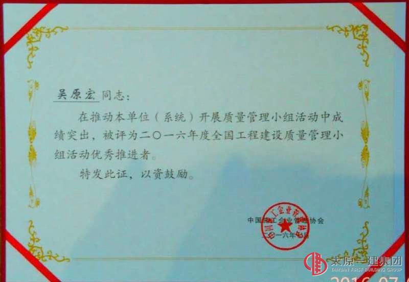 中国施工企业管理协会2016年度优秀QC成果活动发布会在福建省厦门市隆重召开。会议的主题是“万众创新•扎实推进•分享提升”。来自全国各地700余家施工企业共928个成果(涵盖管理型、创新性、现场型、公关型和服务型)全部进行发布。我集团公司吕梁分公司汾阳监狱项目部QC小组课题《提高超大斜坡烧结瓦屋面施工质量合格率》荣获二等奖。另外通过协会评审我集团公司荣获2016年度全国工程建设质量管理优秀企业、总经理李世雄被评选为全国工程建设质量管理卓越领导者、汾阳监狱项目经理吴原宏被评为全国工程建设质量管理小组活动优秀推进者。在此表示祝贺。