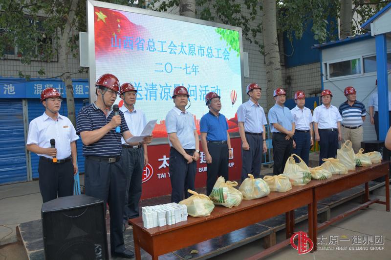 骄阳似火的七月,正值施工生产的黄金时节。为了切实加强高温期间广大职工和农民工兄弟的身体健康和生命安全,做好项目一线防暑降温工作,7月14日下午,省市两级工会在山西省人大常委会副主任、省总工会主席田喜荣和太原市总工会主席冯晋生的带领下,莅临集团公司承建的山西行政学院(中共山西省委党校)综合教学楼项目,开展“夏送清凉”慰问活动。集团公司党委书记、董事长王贵聪,党委副书记、总经理李世雄,党委委员、工会主席李瑞琪,党委委员、副总经理、易通劳务公司经理李伟、十三分公司党支部书记、经理孟计根以及山西行政学院(中共山西省委党校)院校领导陪同下对施工一线的工人进行了慰问。慰问组一行为项目管理人员和农民工兄弟送去了毛巾、矿泉水、西瓜、绿豆等一系列防暑降温物品。田主席再三叮嘱项目部要统筹安排好施工时间,错峰施工,做好防暑降温工作;叮嘱一线管理人员和农民工兄弟要注意身体,做好高温下的自我调节,防止中暑生病。集团公司领导就该项目的施工组织、安全生产、工程进度等工作做了重点强调和安排,并要求项目部要做好高温下的安全生产工作,为农民工兄弟创造良好的生产生活环境。