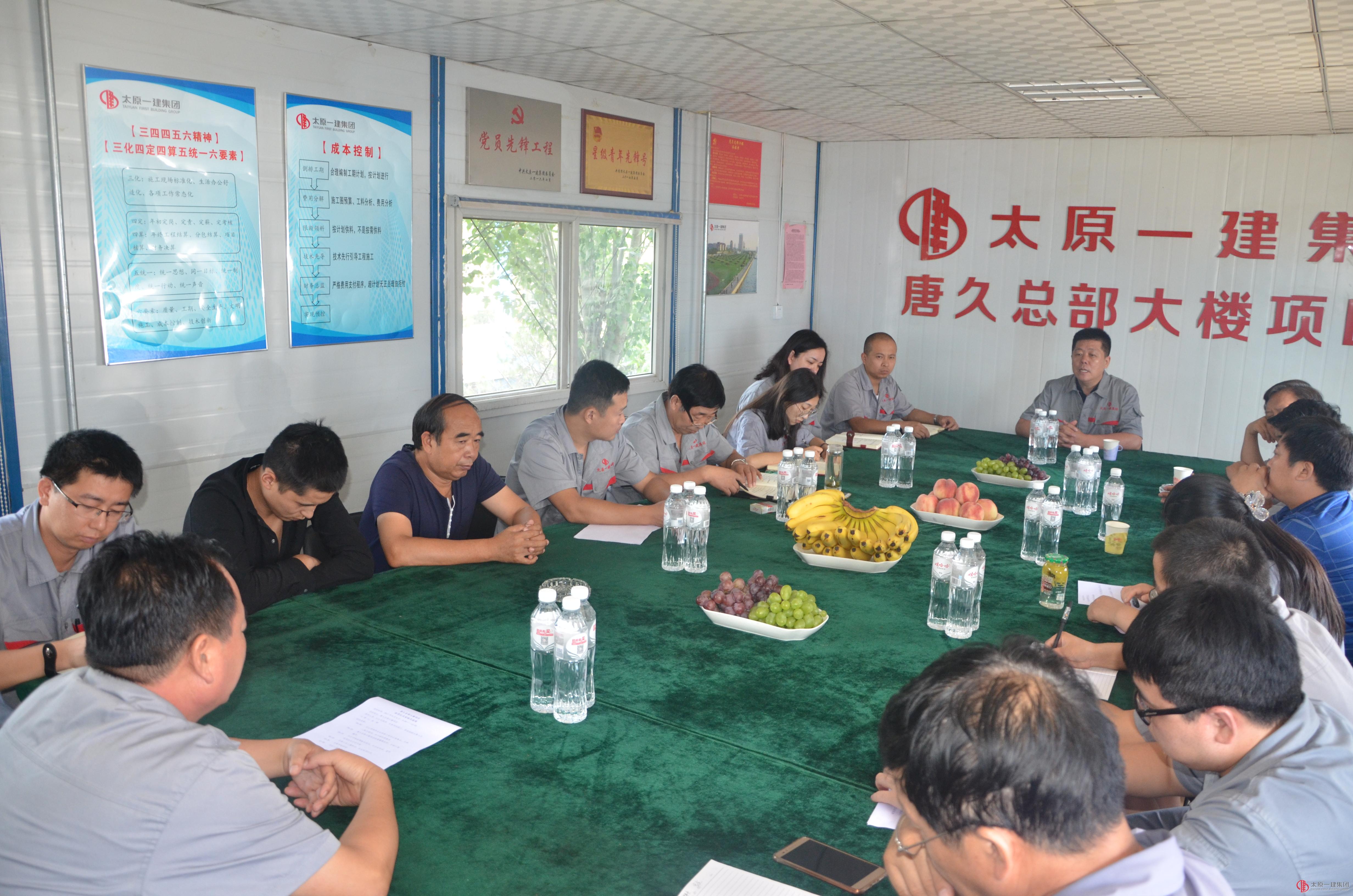 9:30,各位领导及同事齐聚项目部会议室,首先由项目经理霍建介绍唐久总部大楼项目工程概况及施工过程情况。霍建表示:“唐久项目部封顶是一个阶段的结束,但同时也是一个新阶段的起点,唐久项目部全体员工必当团结一致,克服困难,给分公司一个交代,给自己一个交代,争取完成本年度计划目标”。郭经理对唐久总部大楼来之不易的封顶给予肯定,对奋战在一线的员工表示感谢,同时对项目员工提出三点要求:1、继续努力,转变思想;2、各负其责,把住关键点;3、自我加压,自我约束。随后由郭经理宣布封顶仪式正式开始。
