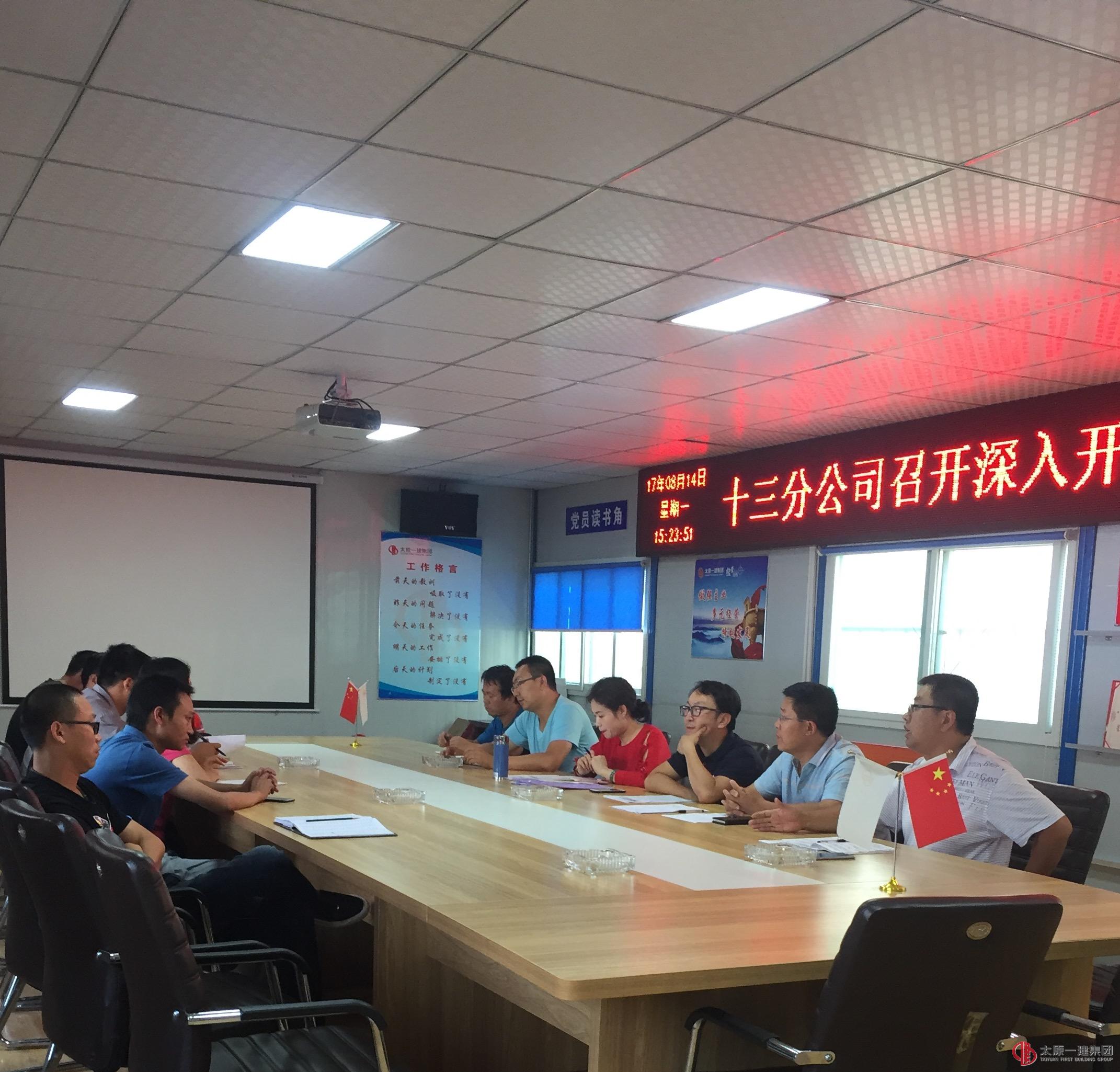 8月14日下午3:00十三分公司在山西省委党校综合教学楼项目部,召开贯彻落实集团公司关于深入开展安全生产大检查动员及工作安排会,会议由分公司生产副经理孟涛滔主持,分公司工会主席任伟娟、各项目部项目经理、项目主要负责人及劳务队主要负责人参加。
