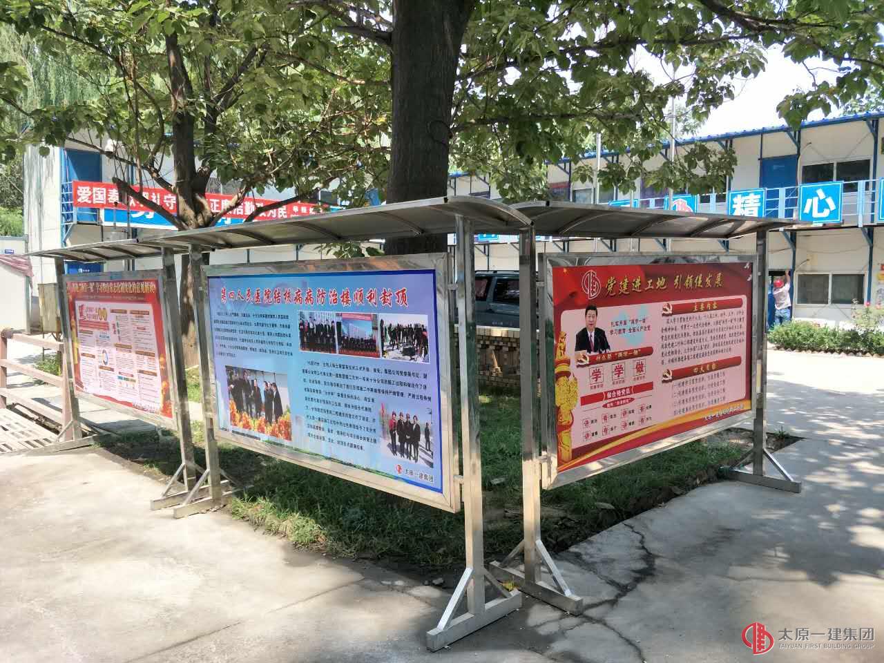 进入现场,感受着职工热气腾腾干劲儿的同时,还有另一番风景吸引着我们的目光。最先进入我们眼帘是从已封顶楼顶飘泻而下的四条红色巨幅标语,“党建进工地,党建促发展”;“党建进工地 ,党建促安全 ”;“党建进工地,党建促质量”;“党建进工地,党建促效益”40个大字标志着该项目已将党建进工地,引领促发展工作放到了项目建设的重要位置。沿着前往办公区的通道看两旁,在排列有序的现场五牌二图前五块党建宣传版面更加醒目,这每一块版面上都记载着十分公司今年支部建设的工作内容,为整个施工现场增加了浓郁的政治色彩。在支部书记办公室墙面上悬挂着是:党员一句话承诺墙和党员学习园地,学习园地张贴着八名党员的学习心得,在这间不大的办公室里党员读书角也同样为支部书记办公室增添着生气和亮丽。顺着彩钢板梯进入项目部会议室,会议室侧面悬挂着的4块长条型版面,将党内“承诺、服务、廉明、监督”内容如诗如画般展现在这有限的空间,提醒每位党员“保持初心,撸袖苦干;为企增光,报效社会”。