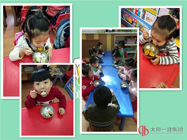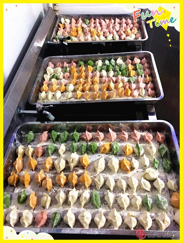 吃饺子更是必不可少的节日饭。谚云:"十月一,冬至到,家家户户吃水饺" ,幼儿园组织孩子们一起动手包饺子,小小的手擀皮、包馅、捏皮,颇有小大人的样子。虽然包出的饺子形态各异,也把面粉蹭的到处都是,但是认真的小模样真是让人疼爱不已。各班老师也特别为孩子们制作了造型各异的三色饺子,蔬菜榨出的天然色素为饺子平添了一分活泼与喜庆;巧手捏出的精致造型为饺子涂增一抹可爱与灵巧。孩子们兴致勃勃的吃着三色造型饺子,冬至的意义似乎就那么立体、生动,跃然于孩子们的唇齿上来。