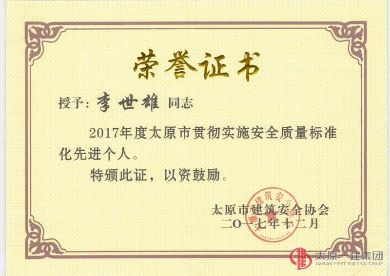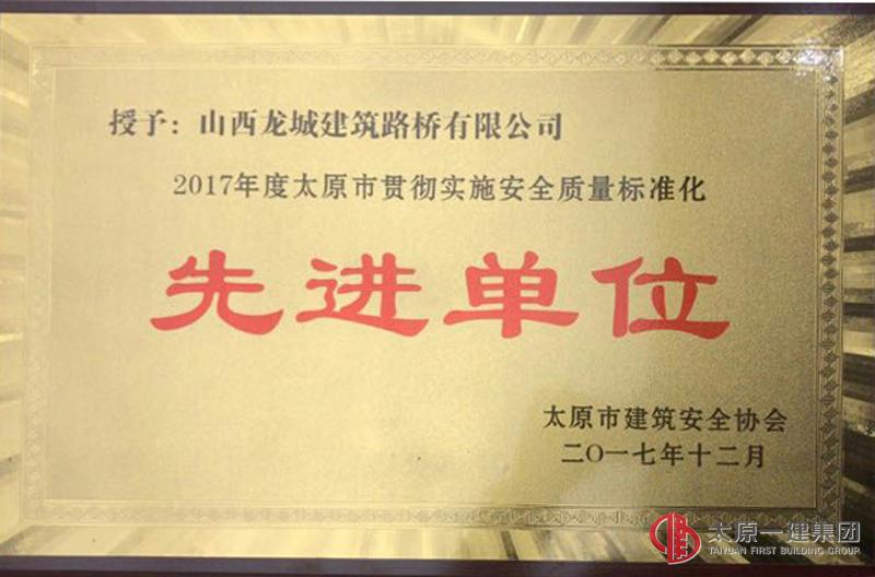 12月29日上午,太原市建筑安全协会在三桥大厦组织召开“太原市建筑安全协会2017年度工作总结暨表彰大会”。会上,太原市第一建筑工程集团有限公司、山西龙城建筑路桥有限公司、山西易通建筑劳务有限公司荣获2017年度太原市贯彻实施安全质量标准化先进单位。集团公司董事长王贵聪、总经理李世雄荣获2017年度太原市贯彻实施安全质量标准化先进个人。集团公司总经理助理赵峰当选为太原市建筑安全协会常务副会长,荣获2017年度太原市贯彻实施安全质量标准化突出贡献奖,并于大会上在贯彻实施安全文明标准化管理经验方面做了交流发言。这些荣誉的取得,是集团公司一年来在贯彻实施安全质量标准化工作中努力付出的具体表现,在新的一年里,我们将继续秉承“务实创新,自强致胜”的企业精神,牢记自己的责任和使命,争取2018年取得更大的成绩。