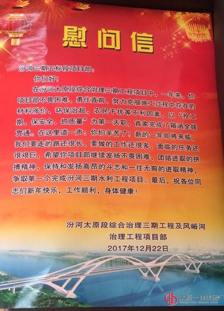 12月29日汾河太原段综合治理第三期工程指挥部为六分公司承建的汾河段综合治理第三期工程五标段项目部送来慰问信和表扬信,感谢项目部在项目经理陈宏的带领下,全体项目管理人员齐心协力,不惧严寒,科学组织,抢工期、保安全、保质量、实现暗涵首家全线贯通,为其他标段树立了榜样。下一步,争取成为汾河太原段综合治理第三期工程第一个完成的标段,为确保青运会重点工程做出积极贡献。