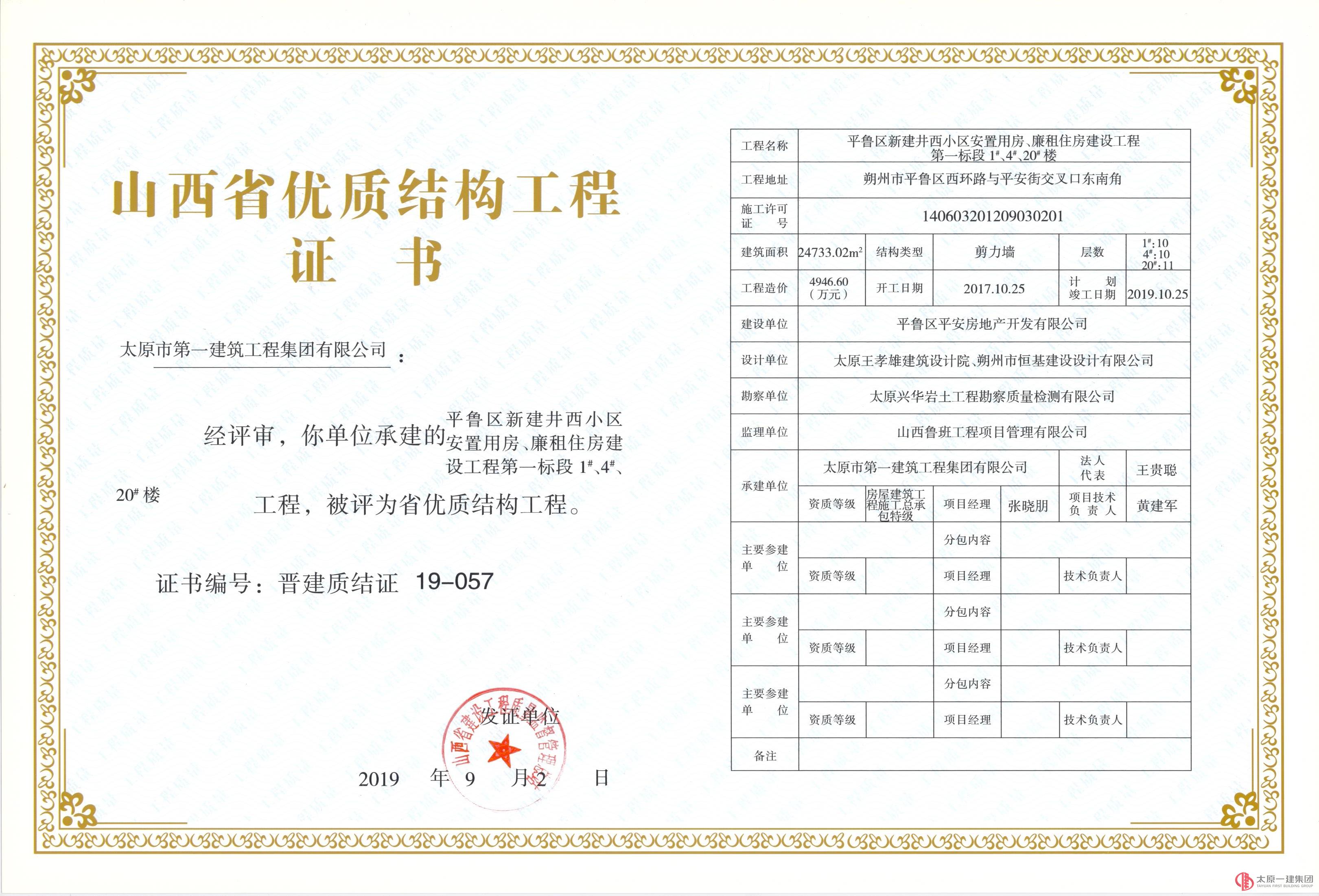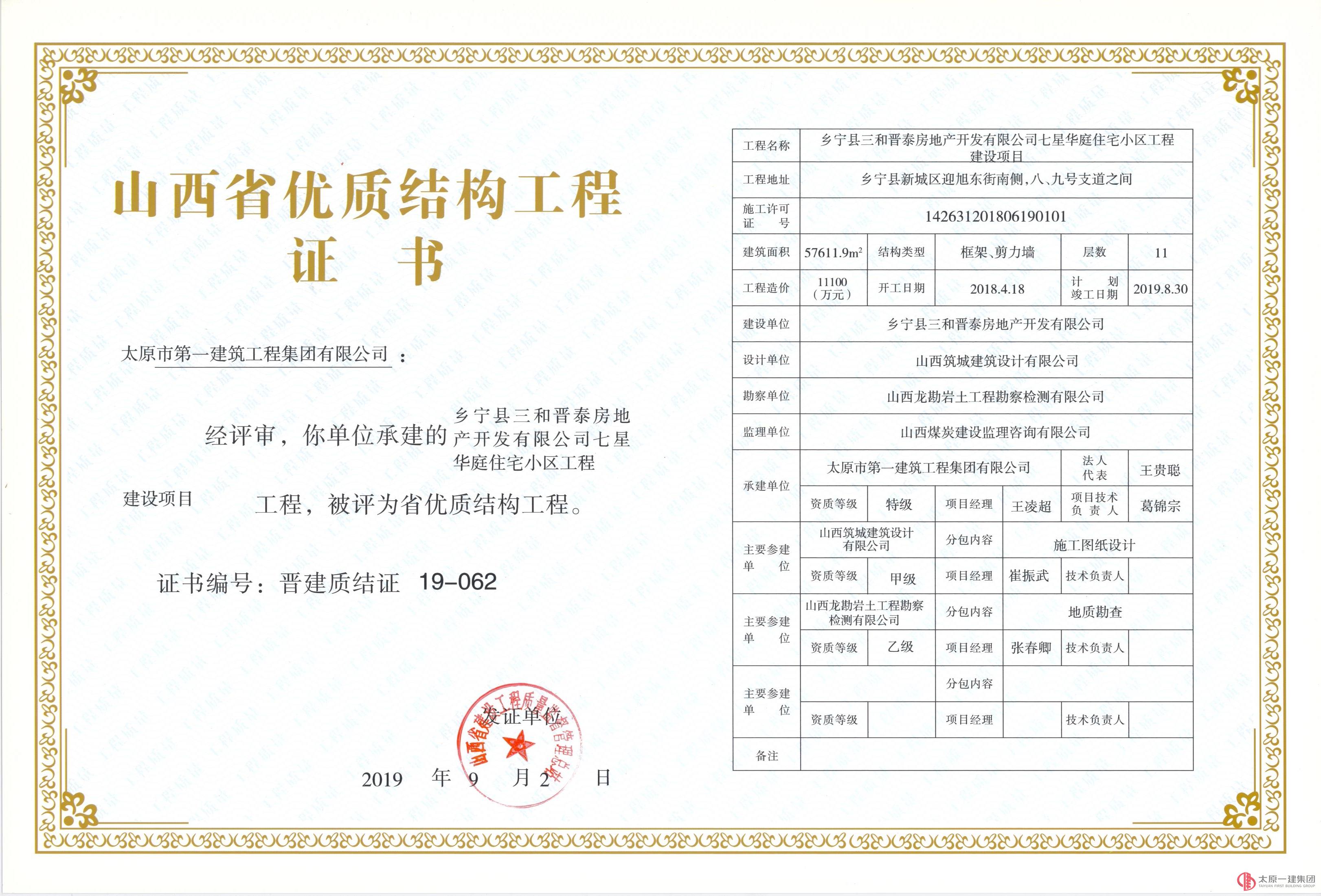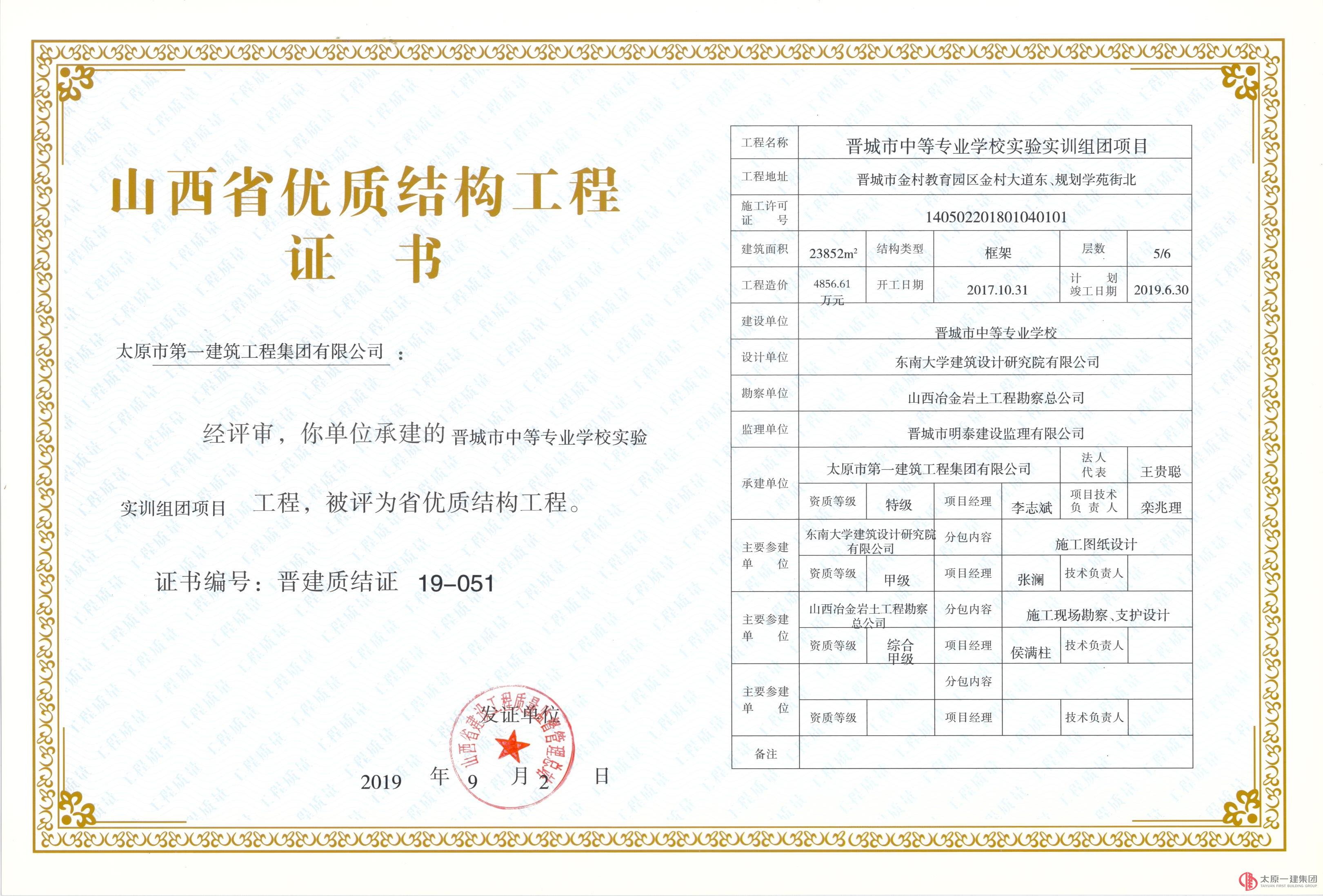截止目前,2019年集团公司创省级结构优质工程数量累计已达到七项,位列全省建筑施工企业第三名!太原一建集团将以创建优质工程为契机,珍惜荣誉,再接再厉,为打造品牌一建、创建百年企业不忘初心、牢记使命,为推动山西转型发展,建设美丽并州做出应有的贡献!