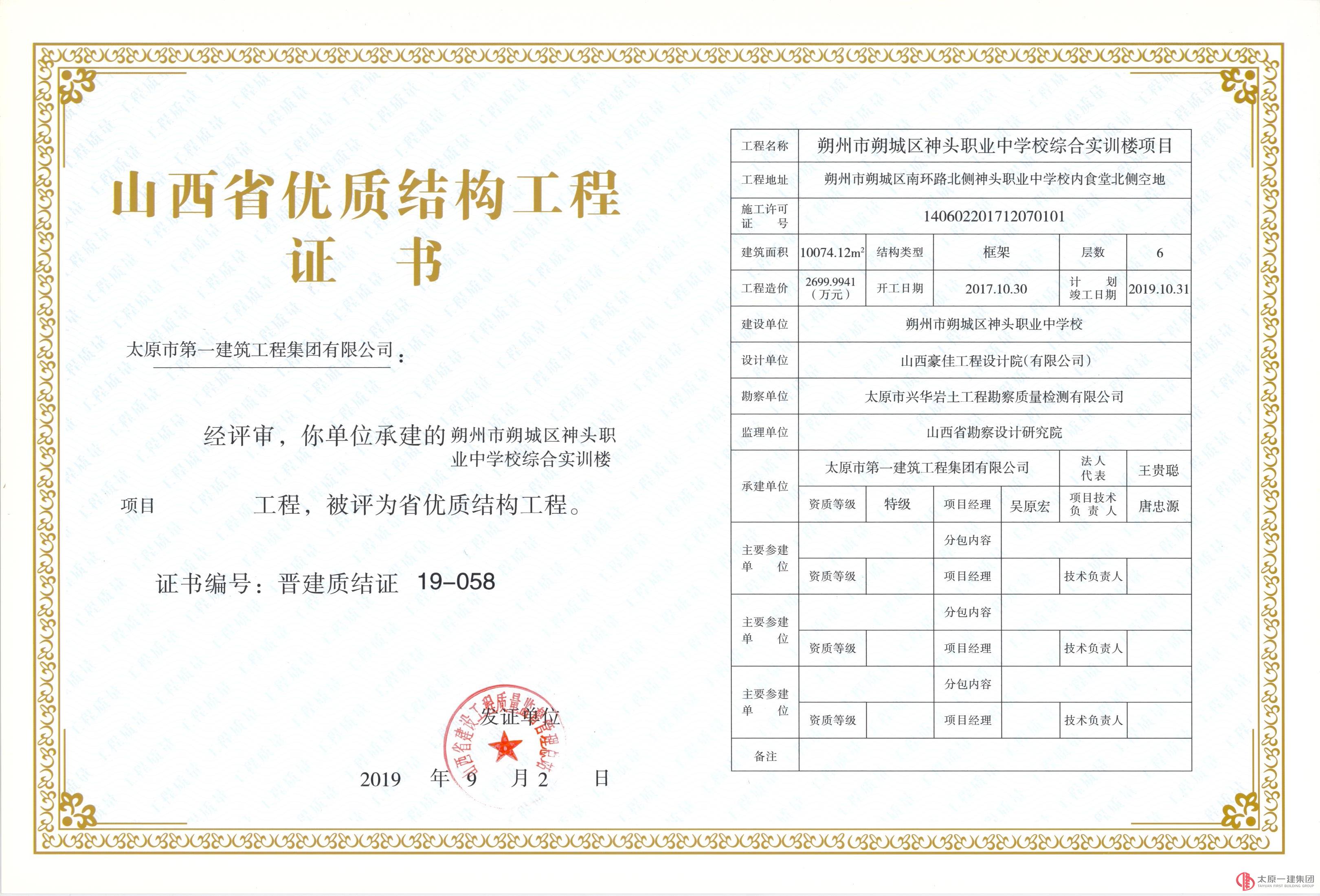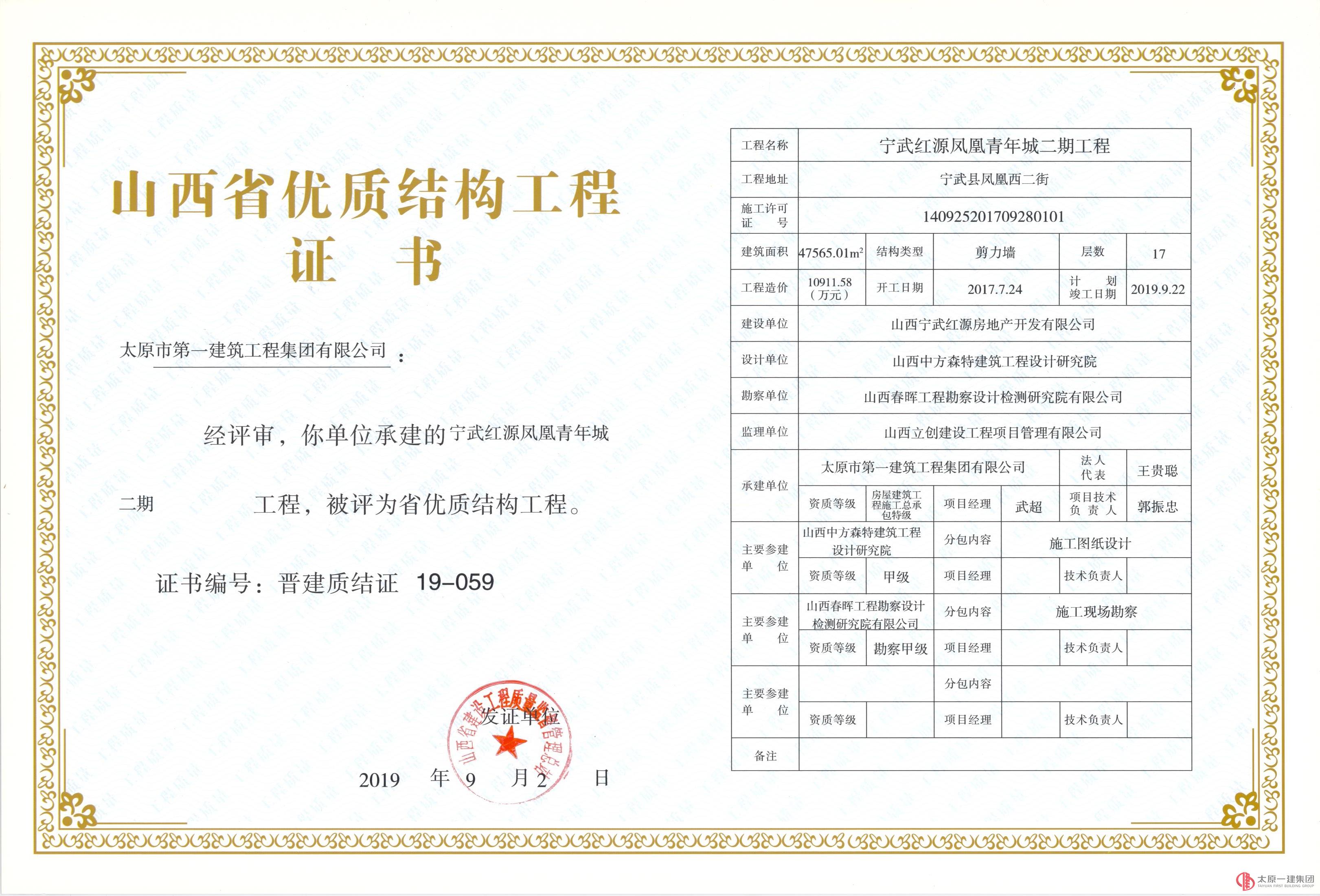 日前,经集团公司申报,山西省建设工程质量监督管理总站组织专家评审,2019年度第一批山西省优质结构工程、山西省优良工程评审结果揭晓,由集团公司承建的八项工程斩获殊荣,分别是:晋城中等专业学校实训组团项目、平鲁区新建井西小区安置用房一标段、朔州神头职业中学综合实训楼、宁武红源凤凰青年城、乡宁七星华庭住宅小区、孝义综合福利中心养护院、吕梁贺昌中学教学实验综合楼七项工程荣获山西省优质结构工程;宁武芦芽山南麓河道综合治理项目荣获山西省优良工程。