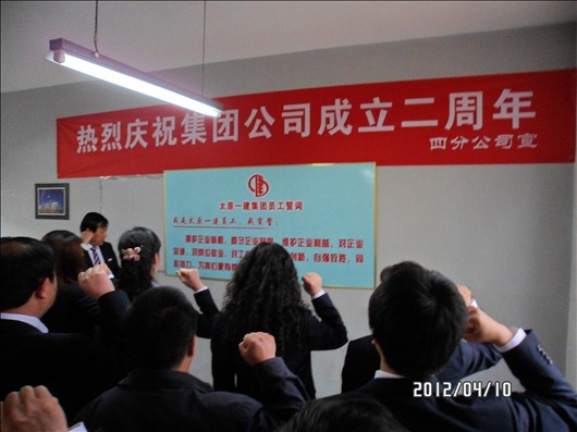 4月10日下午,四分公司组织全体员工,在分公司驻地举行庆祝集团公司成立二周年活动仪式。一、分公司经理王东升宣读了集团公司董事长党委书记、总经理王贵聪在庆祝太原一建集团公司成立两周年活动主旨讲话。二、分公司经理王东升领誓太原一建集团员工誓词,太原一建集团安全誓词。庆祝活动由分公司经理王东升主持。庆祝活动结束后,分公司组织近年来大中专学生,召开畅谈集团公司发展和自己参加工作以来的感想座谈会,会后全体员工进行了庆典聚餐。