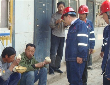 4月30日,集团公司高管层全体领导在董事长、总经理王贵聪率领下头戴安全帽,身着企业工装来到九分公司承建的汾东文体中心工地,对节日期间坚守岗位辛勤工作的全体作业人员、职工进行了看望和现场调研。进入现场后领导们直奔作业区,并步入正在施工的楼上对工程质量、安全防护措施、现场文明施工情况进行了细致检查,然后领导们又到生活区对作业人员的食宿情况进行了检查,王总经理与正在吃午饭的工人们进行了亲切交谈和情况调研。到办公区后,项目经理路立科和分公司经理张岐泰先后分别做了情况汇报,领导们听取汇报后,王总经理作了热情洋溢的重要讲话,首先,认为从施工现场建设到克服施工工艺的难度,体现了九分公司的实力和能力,并对九分公司的整体工作情况表示满意,同时提出了三点要求和希望:1、保持持续、健康、积极的发展态势,通过努力进一步增强实力,在经营的项目上要选择优良的、有形象代表性的项目,走自建项目发展的道路。2、抓住工程装修阶段的关键,一是施工标准不能降低,二是确保安全生产。3、坚持干、算结合,既要干好、也要算好。努力降低成本,提高效益,通过努力要干出九分公司的特色来。中午领导们与项目部管理人员、分公司领导及作业队负责人在项目部食堂共进午餐,对大家以示节日的祝贺和深切的慰问,极大的鼓舞了职工士气。