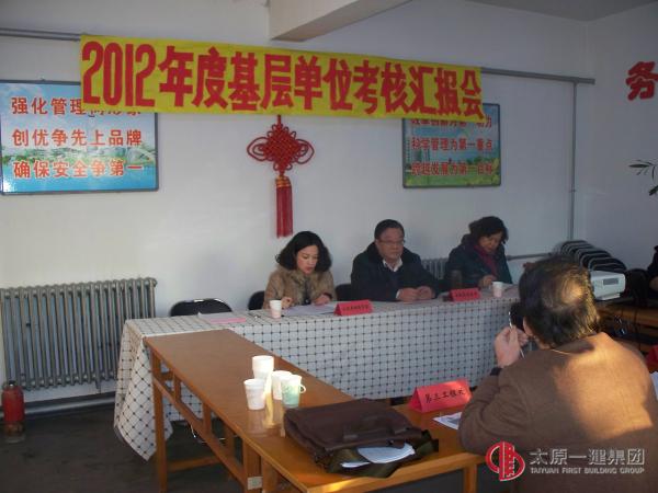 会上,王丽莺同志宣读了集团公司并一建董发(2012)8号、并一建经发(2012)50号《关于开展全面总结考核活的通知》文件,各基层单位按照会议议程先后进行了PPT演示汇报,在观看、听取了各单位的演示汇报后,考核组组长王斌逐一对3个基层单位进行了点评,在肯定成绩的同时,重点指出了工作中存在的不足和差距,并针对性地提出了希望和要求。接受考核的3个基层单位领导班子成员及考核组成员共计15人参加了会议。