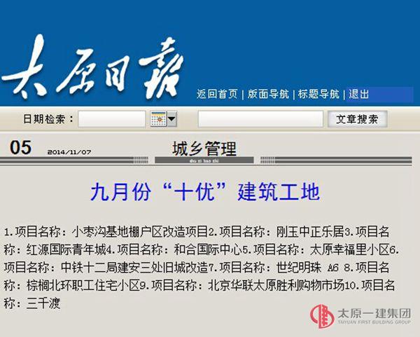 由我分公司承建的红源国际青年城2#商住楼项目,被太原市城乡管理行政执法局评选为九月份太原市“十优”建筑工地,且位列前三。