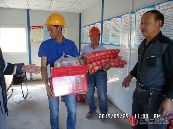 双节临近,节日气息渐浓。25日上午,四分公司经理王东升、主任会计师焦富娟等带着慰问品来到太原市第四人民医院工地慰问仍在施工一线忙碌的工友们。在施工现场王东升经理对工友们的辛勤付出表示感谢,并给予节日的问候。王经理表示:1、太原一建集团是一个有着优良传统的企业,工友们出门在外免不了会想念家乡、想念亲人。我们虽不能代表亲人,但我们一定要给让工友们体会到家的温暖。2、双节期间一定要注意安全,切实做到安全、生产两不误,精心施工、强化质量管理,确保节点工期目标。劳务队现场负责人表示:感谢分公司领导的关心,让远在他乡的我们感受到家的温暖。我们一定不辜负公司的期望,按时保质保量地完成施工任务。随后,王经理和项目部人员向劳务班组发放慰问品。