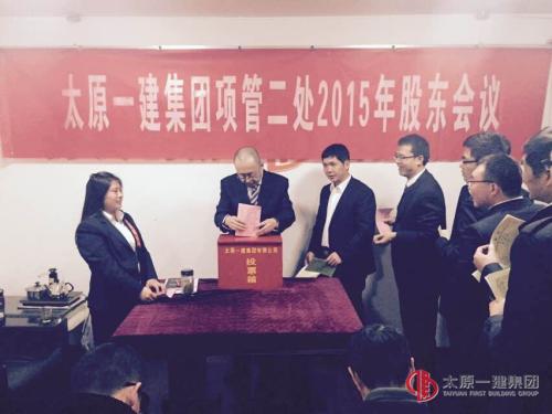 2016年1月16日下午,项管二处召开了2015年度股东会议。会议由授权委托人王斌主持。本次会议严格按照规定程序进行,会上全体股东听取了2015年度董事会工作报告(草案);监事会工作报告(草案);2015年度财务决算报告(草案)、2015年度利润分配方案(草案)和2016年度财务预算方案(草案)、《第二个三年发展规划》执行情况和《第三个三年发展规划》制定说明(草案)等七项报告,按照规定程序,经全体股东讨论、表决,一致同意并通过上述报告。处长王斌宣读了第三届董事会董事、监事会监事(股东)候选人的简历,进行投票选举,公示了选举结果。会后办公室将会议资料汇总,上报集团公司。