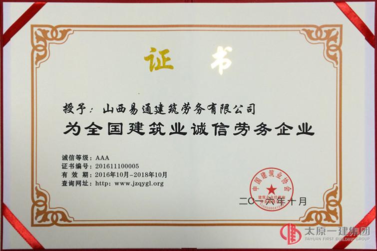 易通劳务公司荣获全国AAA级建筑业诚信劳务企业称号