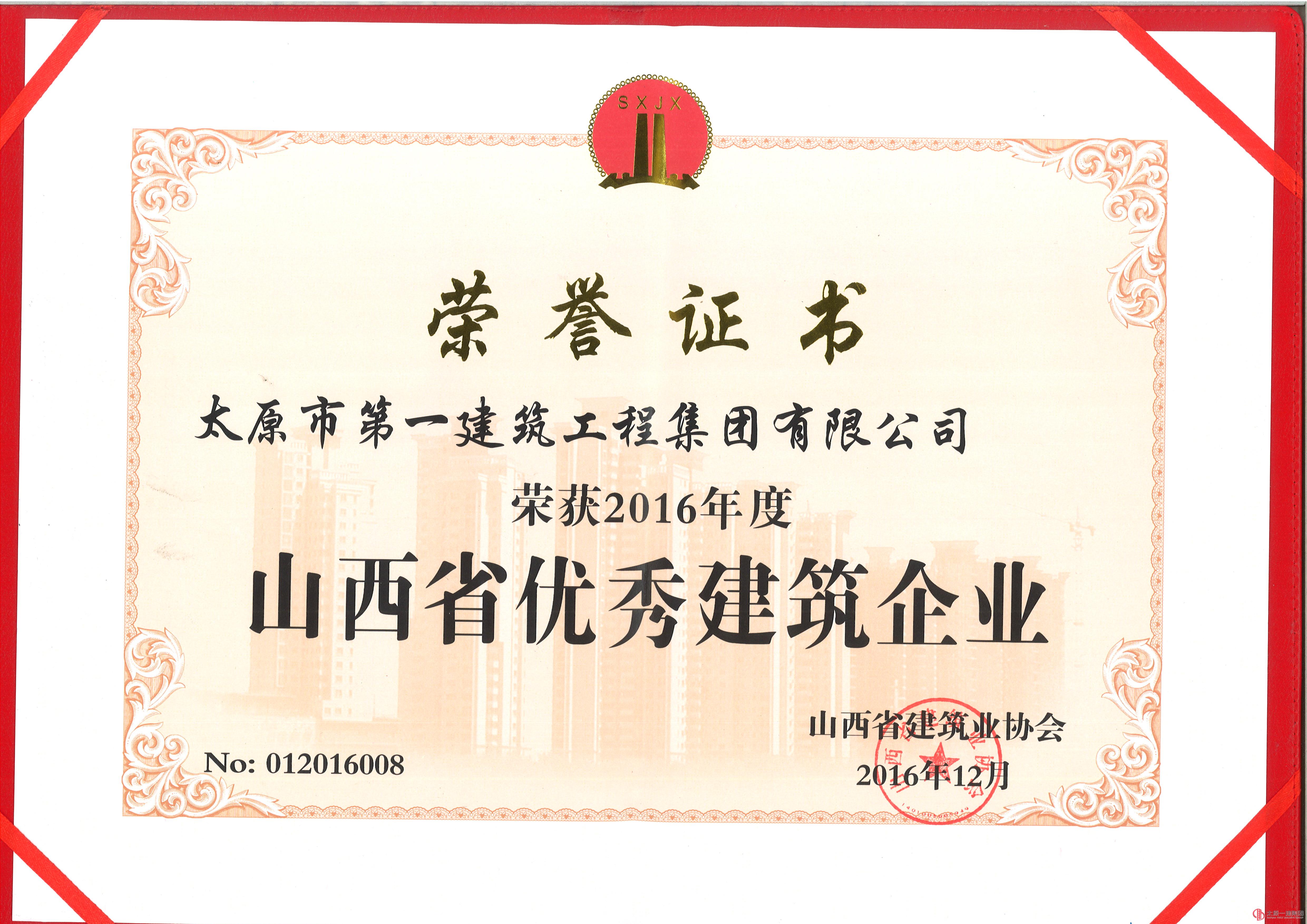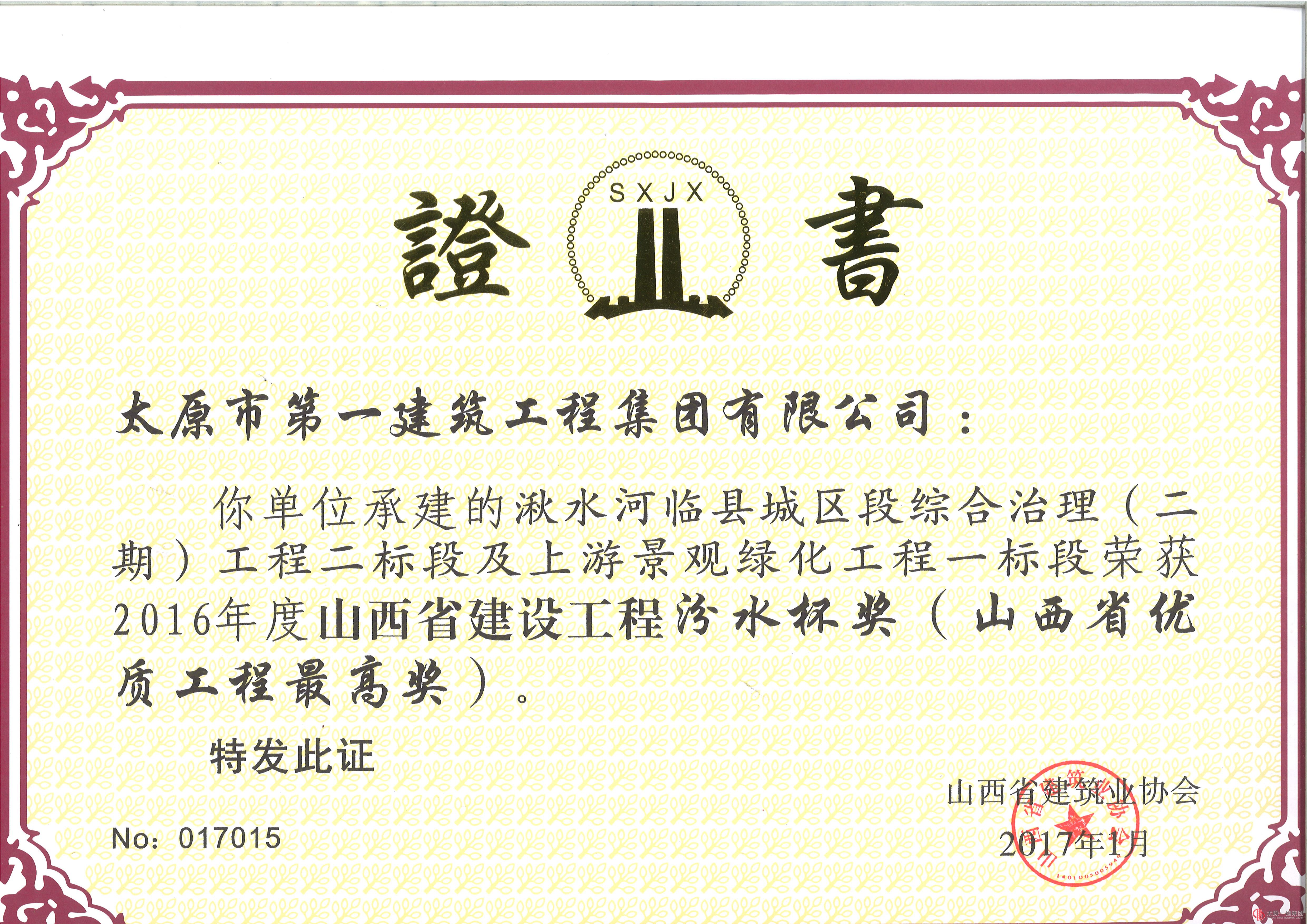 2017年4月1日,山西省建筑业协会在并举办三届七次理事会暨表彰大会。会上,公布并表彰了2016年度山西省建筑业优秀建筑企业、优秀经理、优秀项目经理及2016年度山西建设工程汾水杯奖项的决定。集团公司荣获2016年度山西省建筑业优秀建筑企业;王贵聪荣获2016年度山西省建筑业优秀经理;张浩、李建虎、张晋峰荣获2016年度山西省建筑业优秀项目经理;湫水河临县城区段综合治理(二期)工程二标段及上游景观绿化工程一标段;霍煤李雅庄矿生活区高层住宅3#楼;临钢俱乐部广场高层住宅5#住宅楼及地下车库三项工程荣获2016年度山西建设工程汾水杯奖项。