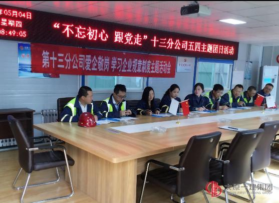 5月4日早8:30,十三分公司35岁以下全体青年职工,在山西省委党校项目部开展了“不忘初心 跟党走”、“爱企敬岗爱业”学企业规章制度的主题团日活动。