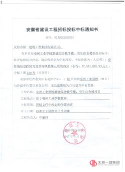 2017年5月5日,项目管理公司中标亳州工业学校新建综合教学楼、男生宿舍楼项目,中标金额壹仟柒佰壹拾陆万。该工程位于安徽省亳州工业学校校内,中标日历工期120天。