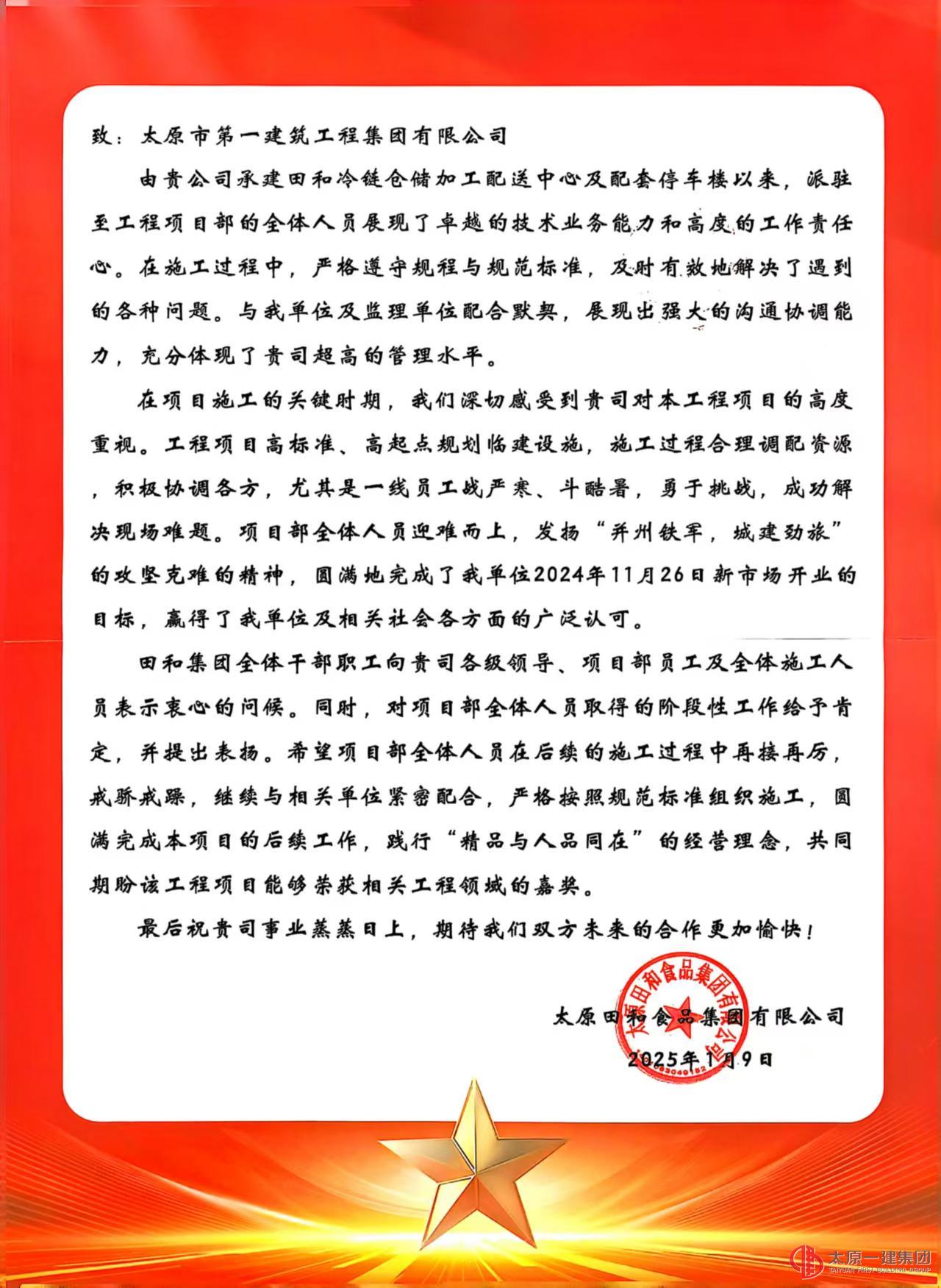 2025年1月9日,太原田和食品集团有限公司董事长刘浩明一行六人莅临太原一建集团,并向太原一建集团送来表扬信。